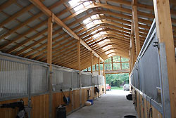 Der Hof bietet seinen Pensionären rund 60 Boxen, die auf acht verschiedene Ställe verteilt sind. Jeder Stall hat eine separate Sattelkammer, ein eigenes Waschbecken, ein Heu- und
